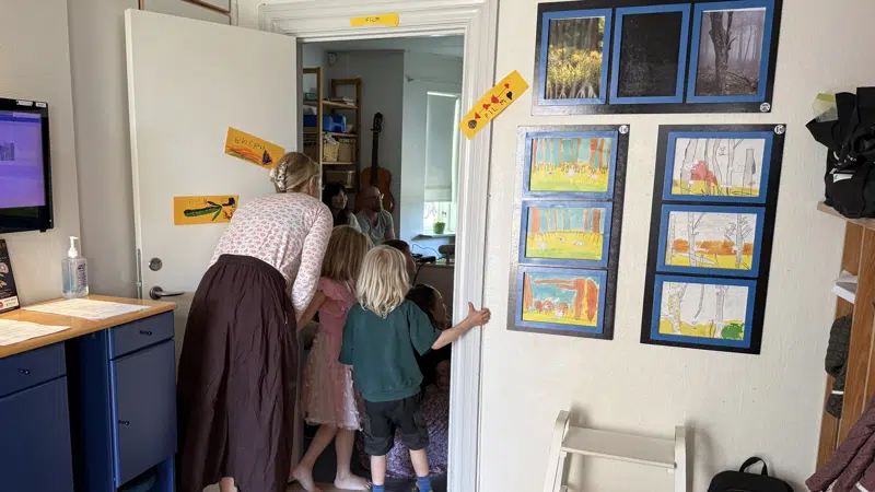 foto: Når vi vasker hænder i Blåbærhuset, er det nede ved vores akvarie. Vi har selv tegnet fiskene!