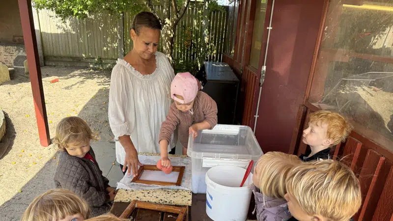 Det er en sansemæssig stor udfordring for nogle af børnene at have fingrene nede i vandet med pulpen eller i det våde papir, inden det bliver blendet til pulp.