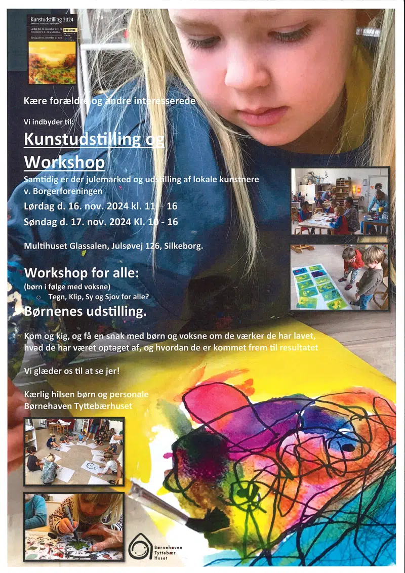 Den 16. og 17 november 2024 i Multihuset i Sejs, udstiller alle vores børn de værker de har arbejdet med siden august. Kom og kig! Alle er velkommen! Børn og personale vil gerne fortælle om det vi har lavet. Vi håber, at vi ses!