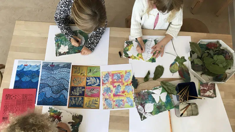 Kunstprojekt: Vi er godt i gang med at trykke og tegne på vores hjemmelavet papir, men det er en lang proces. Vi håber, at børnene selv fortæller hvad vi har gang i undervejs.